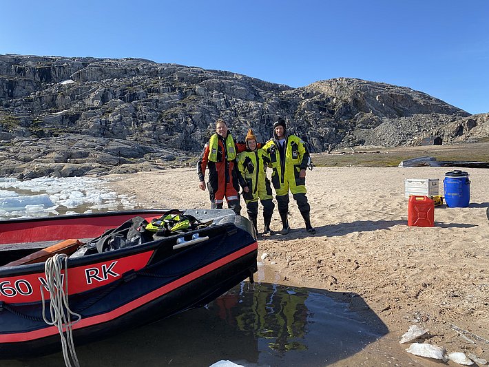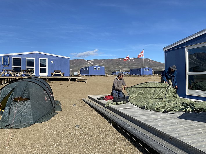 Ma naturalmente non è così semplice. Già prima di partire, siamo stati informati della presenza di molto ghiaccio al largo di Clavering Ø a causa di una direzione del vento sfavorevole, che potrebbe rendere impossibile il trasporto in barca. Dopo il nostro arrivo a Zackenberg, la situazione non sembra necessariamente migliore e le attuali immagini satellitari non permettono di trarre conclusioni chiare. Fortunatamente, un'isola ha in sé la possibilità di circolare teoricamente su entrambi i lati. Il problema è che ci sono zone di acqua bassa che si stanno insabbiando sempre di più. Con l'alta marea siamo riusciti a passare, ma sono circa sette anni che nessuno percorre questa strada. Questo significa maggiori problemi e complicazioni. Kent, Jonas e Jonas von Zackenberg devono prima esplorare questo percorso. Partono in barca prima dell'alta marea, in modo da essere sul posto con l'alta marea. In corrispondenza delle secche, devono scendere dalla barca e tirare per trovare i punti più profondi, che poi segnano con pali di legno. Il tutto in tute di sopravvivenza sudate contro l'acqua fredda. Più tardi, in barca, con il vento forte, si congelano ancora di più. Ma ce la fanno, ma poi devono aspettare circa dodici ore sull'altra sponda per il ritorno della prossima alta marea. Non è una giornata molto breve per loro, ma a Zackenberg ricevono un'accoglienza da eroi. Poi viene imballato altro equipaggiamento, compreso quello di ricambio per Andreas. La compagnia aerea gli consegnerà il suo equipaggiamento solo al termine della spedizione. Due giorni dopo, il momento è arrivato. Superiamo le secche con la barca e riusciamo ad ormeggiare tra le banchise di Eskimonæs.