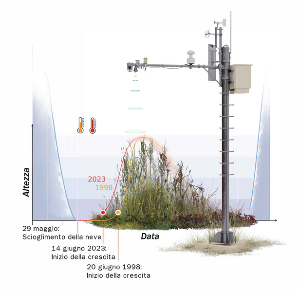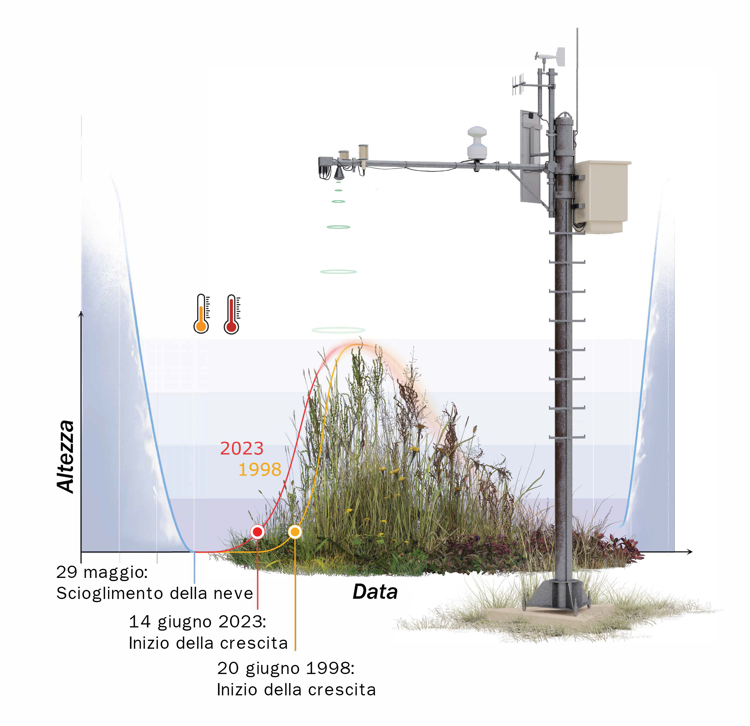 - Periodo di vegetazione più precoce a causa dei cambiamenti climatici: in montagna, le piante iniziano a crescere in media sei giorni prima rispetto a 25 anni fa, a causa delle temperature più alte dopo lo scioglimento delle nevi.