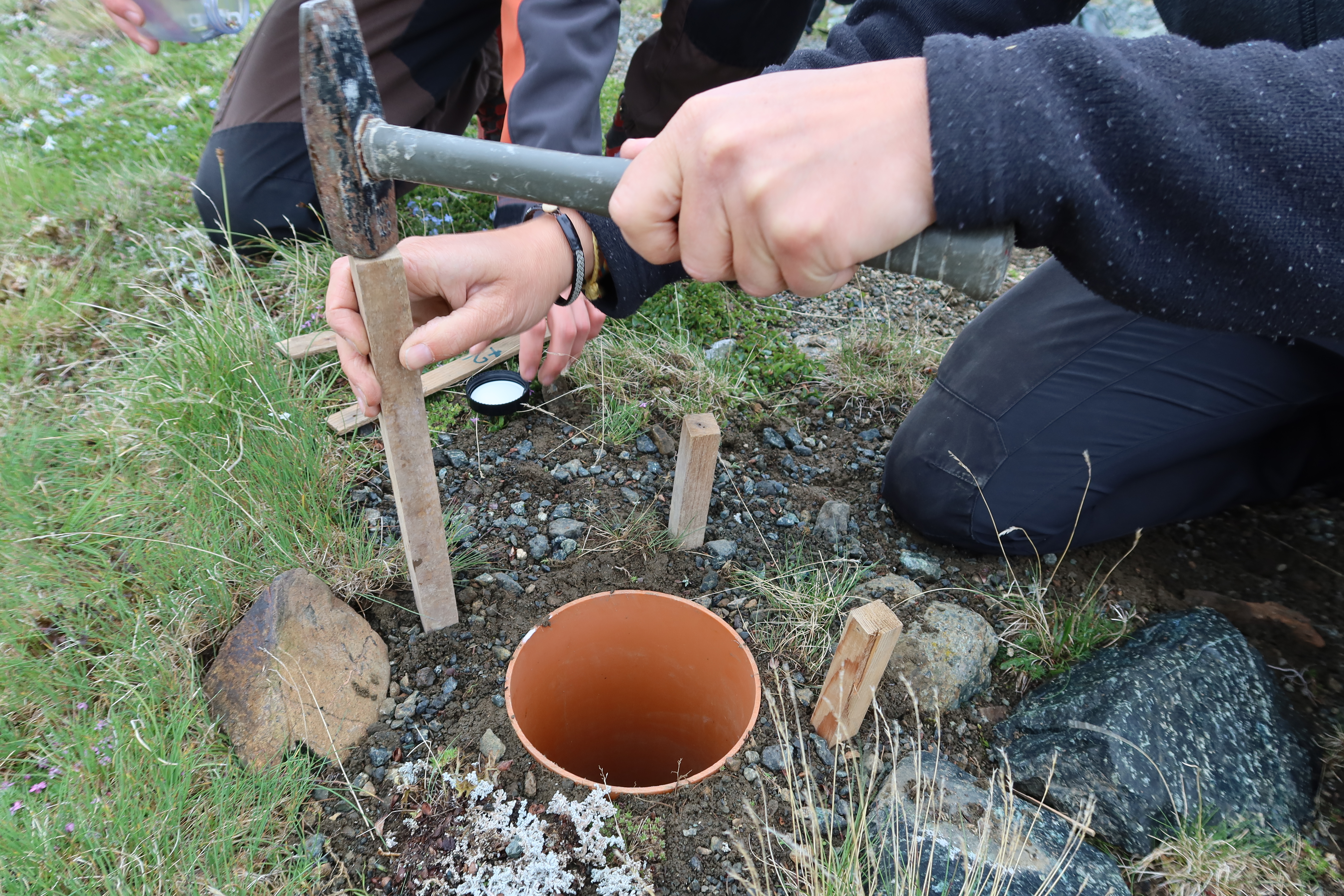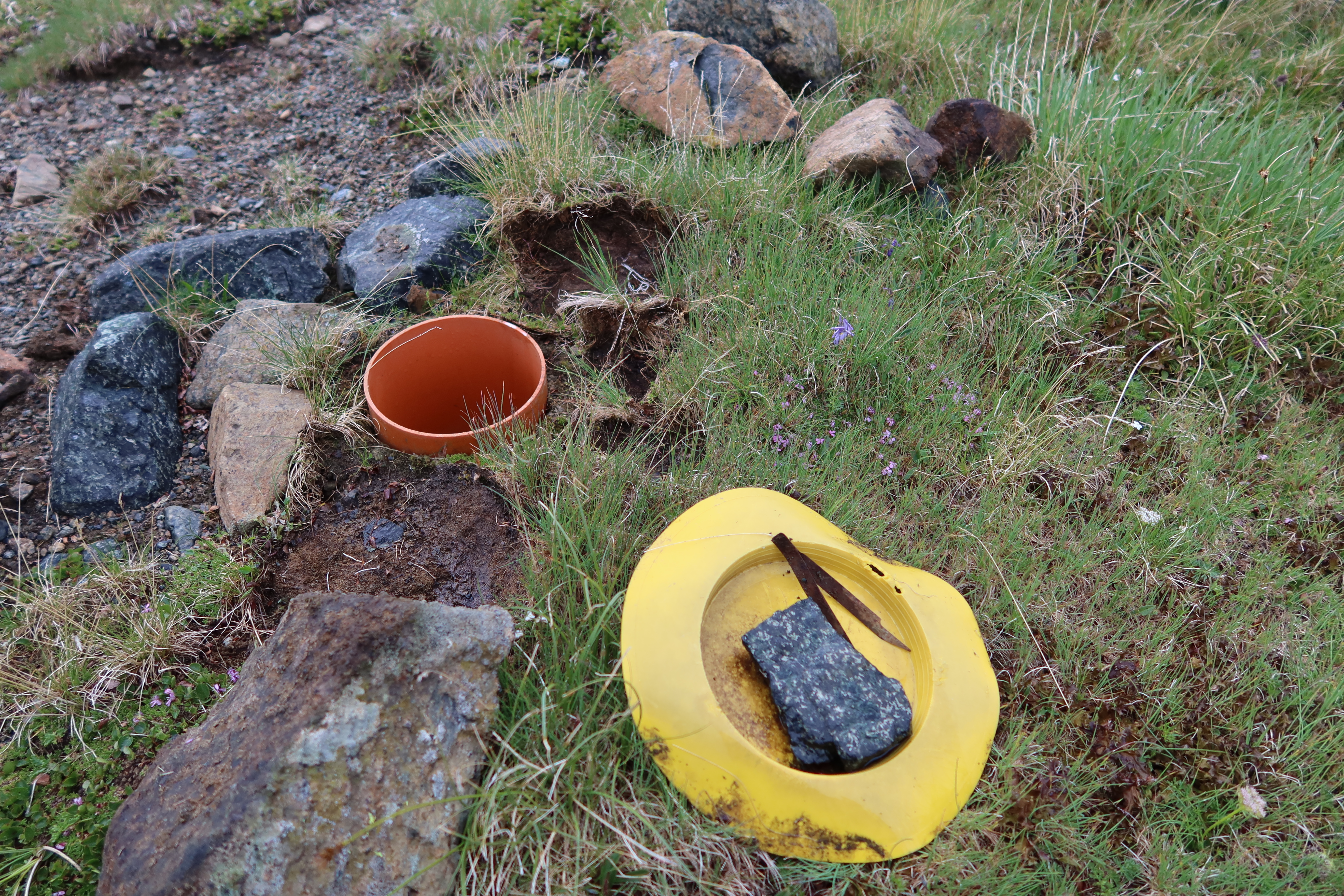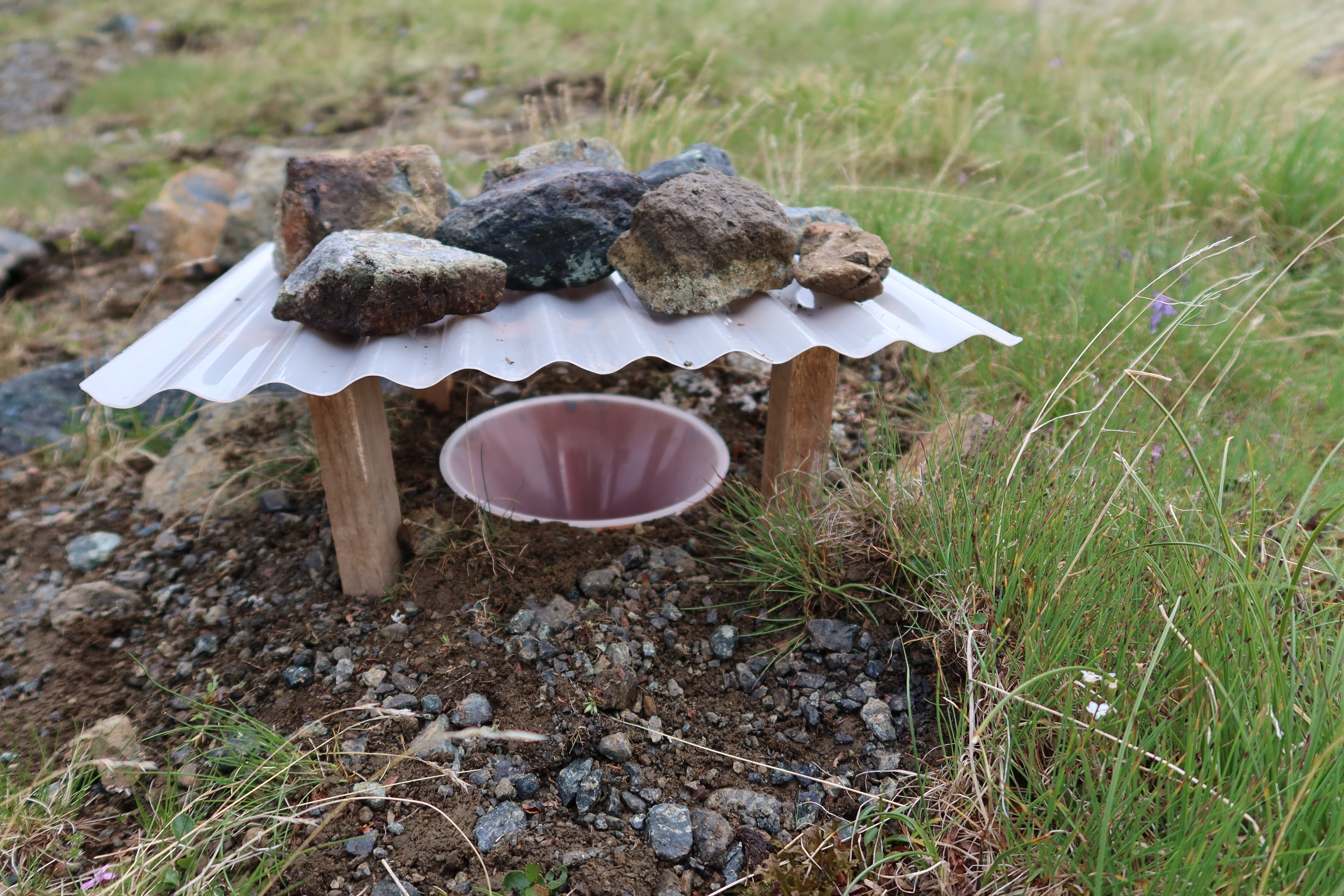 Durante l'indagine, i ricercatori si sono imbattuti in un tubo di plastica nel terreno. "Una parte della vecchia trappola del 2007 è ancora lì", afferma con soddisfazione Kempel. Più vicino di così non si può. Così i tre si sono messi al lavoro, conficcando dei paletti nel terreno, attaccandovi un imbuto di plastica gialla e costruendo un tetto sopra il tubo nel terreno.