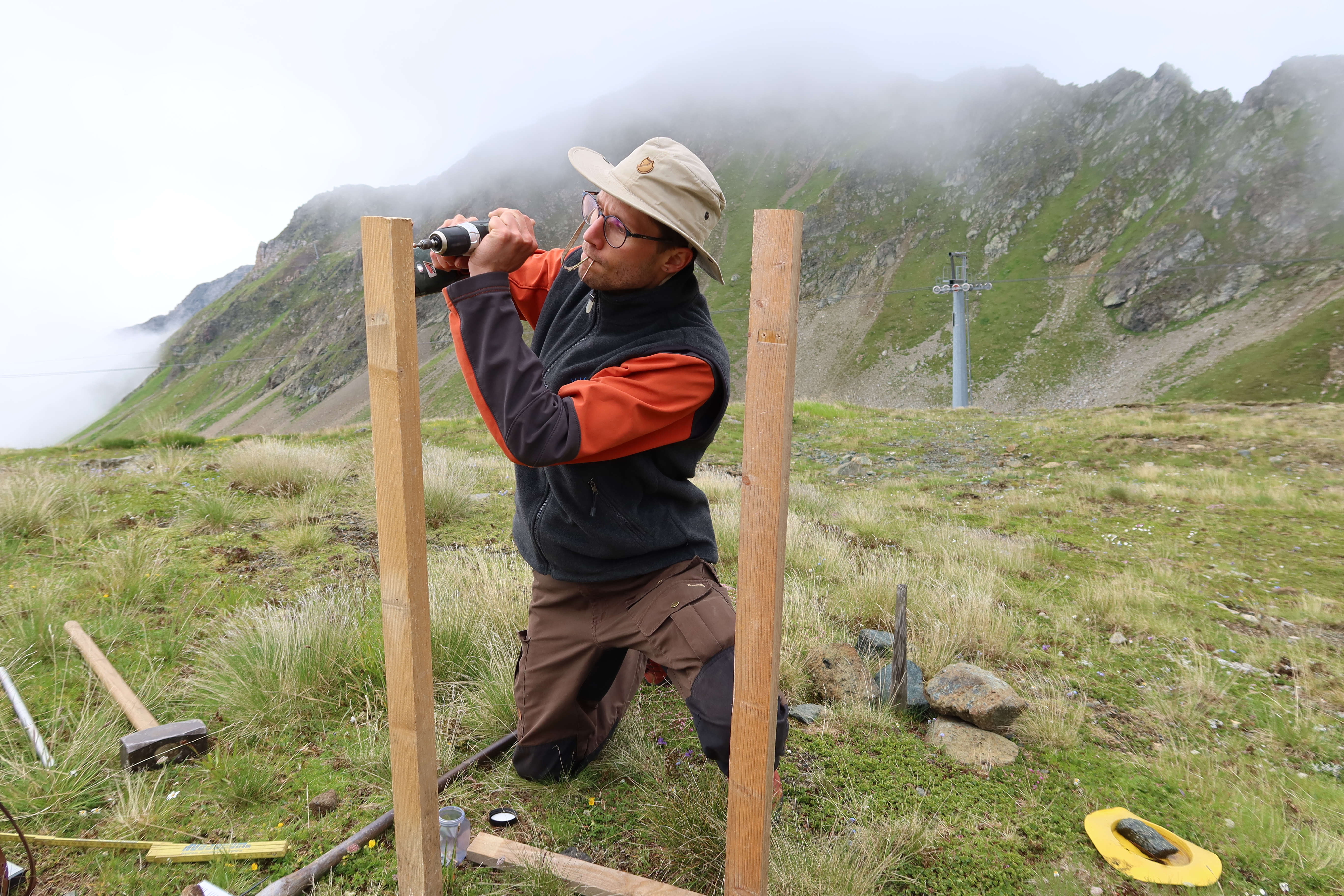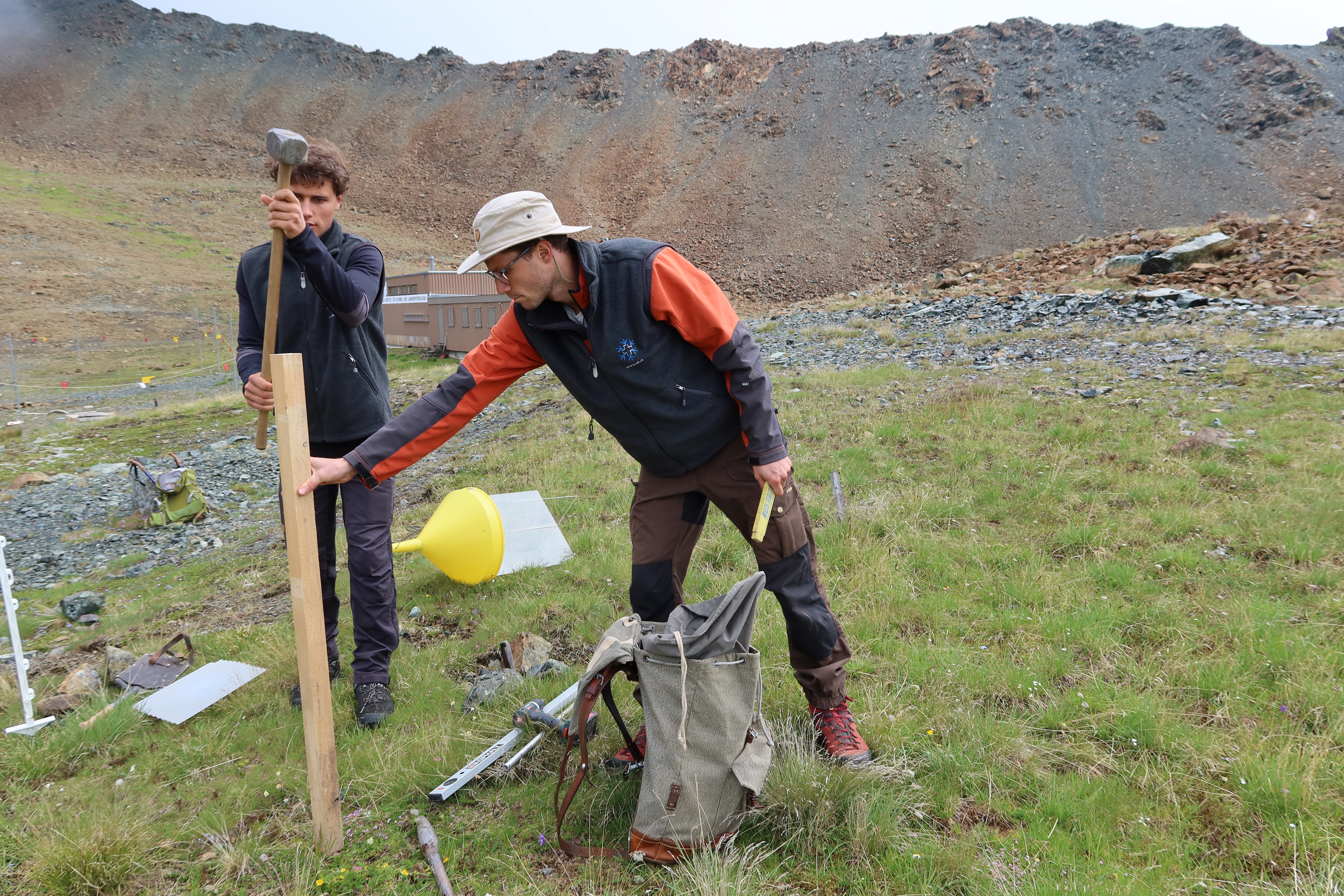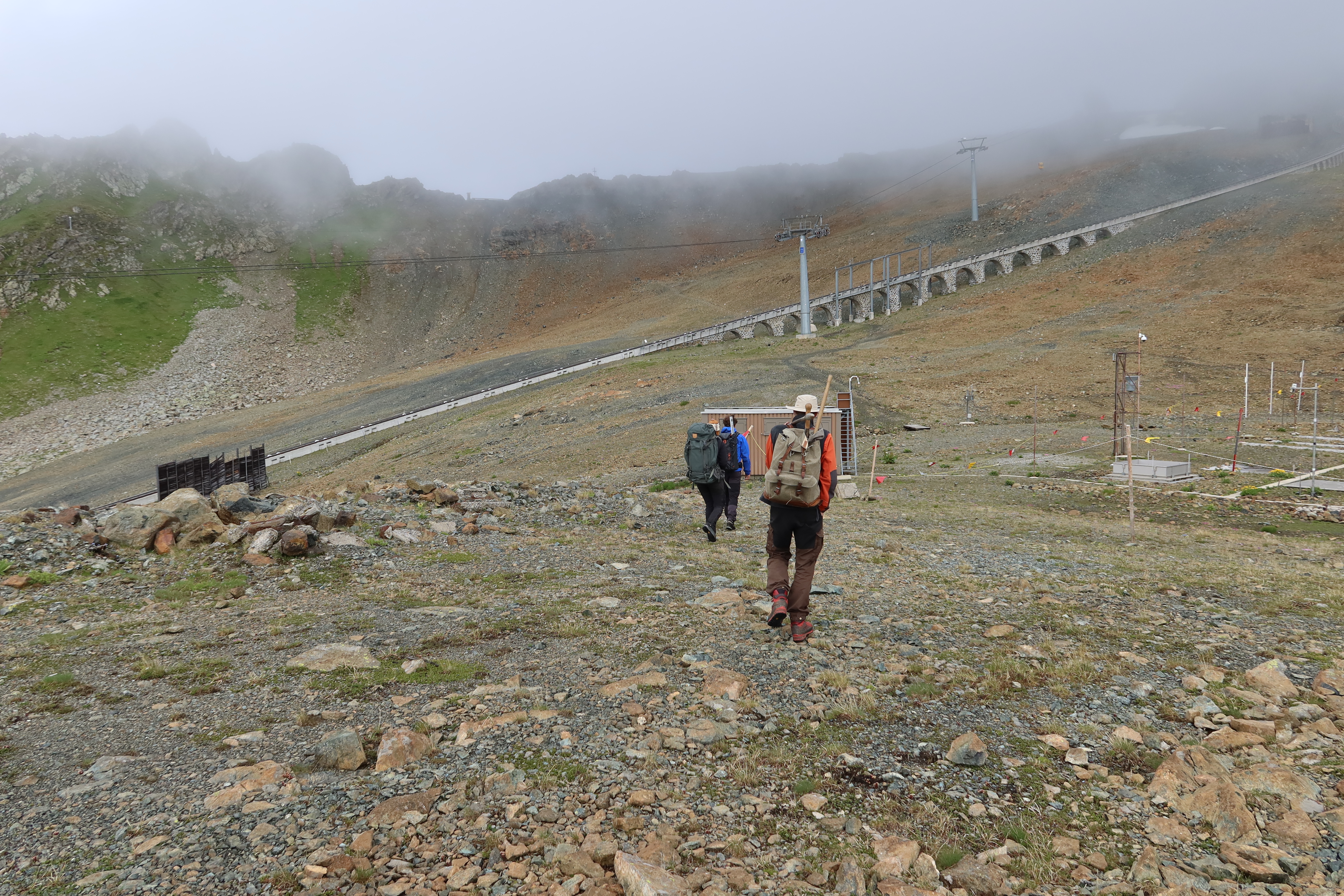 13 luglio, alle nove meno un quarto, la stazione a monte della Parsennbahn di Davos è immersa nelle nuvole. La visibilità raggiunge a malapena i cinquanta metri. Tre persone, cariche di peso, scendono con i loro zaini stracolmi verso il campo sperimentale del Weissfluhjoch. Anne Kempel, biologa dell'SLF, ha sottobraccio due lunghi pali di legno, il suo collega Mathieu Cretton del WSL trasporta una trappola per insetti e Mauro Vareni, operatore del servizio civile, un ferro a pioli, una specie di battipalo in acciaio, per fare dei buchi nel terreno.