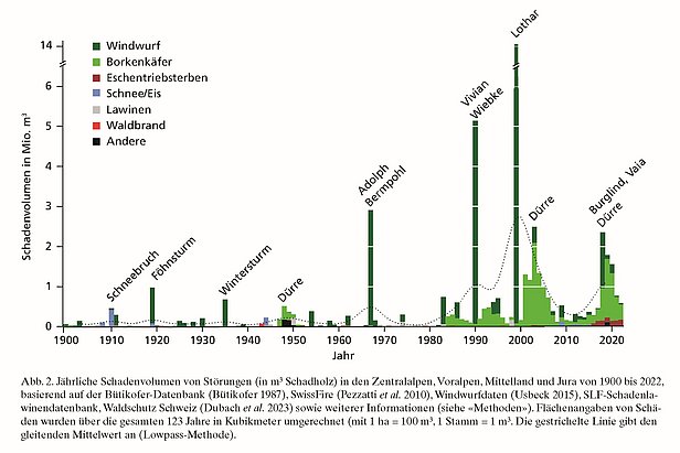 Seit den 1980er Jahren nimmt die Menge an geschädigten Bäumen und Waldbeständen infolge von Witterungsextremen – Forstfachleute sprechen von Störungen – deutlich zu. Für das Ausmass der Schäden ist der Mensch mitverantwortlich: Im Tiefland sind die einst als Nutzholz angepflanzten Nadelbäume heute schlecht an zunehmende Wärme und häufigere Trockenheit angepasst. Auch der steigende Holzvorrat durch Nutzungsaufgabe an schwer zugänglichen Orten erhöht die Schäden. Im aktuellen Klimawandel werden Extreme wie Dürre, Hitze und Spätfrost zum neuen «Normal».
