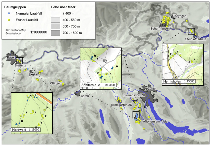 En août 2018, 964 hêtres ont été marqués dans les régions de Bâle-Campagne, Schaffhouse, Bremgarten (canton d'Argovie) et dans l'ouest du canton de Zurich, et les dommages visibles ont été estimés (figure 2).