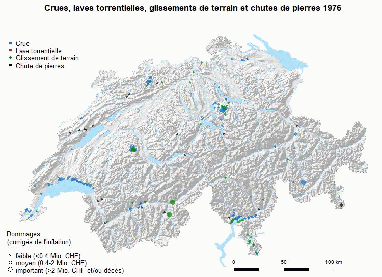 La base de données financée par l'Office fédéral de l'environnement OFEV comprend les dommages causés par les crues, les laves torrentielles, les glissements de terrain et les éboulements et chutes de pierres, et qui se sont produits de manière naturelle. Dans la mesure du possible, nous indiquons également les conditions météorologiques ayant causé les dommages. Nous ne prenons pas en compte les dégâts causés par les avalanches, le poids de la neige, les tremblements de terre, l’éclair, la grêle, les tempêtes ou la sécheresse.