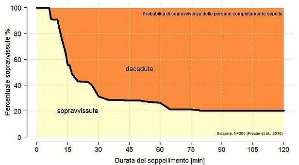 Secondo le statistiche, in caso di seppellimento completo (testa nella neve) sopravvive poco più di una persona su due. La causa di morte più frequente per i sepolti è il soffocamento, perché chi rimane sepolto spesso non ha a disposizione una sacca d'aria o ne ha una molto piccola. Di conseguenza, già dopo 15 minuti le probabilità di sopravvivenza di una persona completamente sepolta si riducono drasticamente (fig. 3, Procter et al., 2016). La veloce localizzazione e liberazione di un sepolto da parte dei compagni assume quindi un'importanza fondamentale. Qui e possibile trovare informazioni sullo sviluppo dei tempi di dispersione e delle probabilità di sopravvivenza.